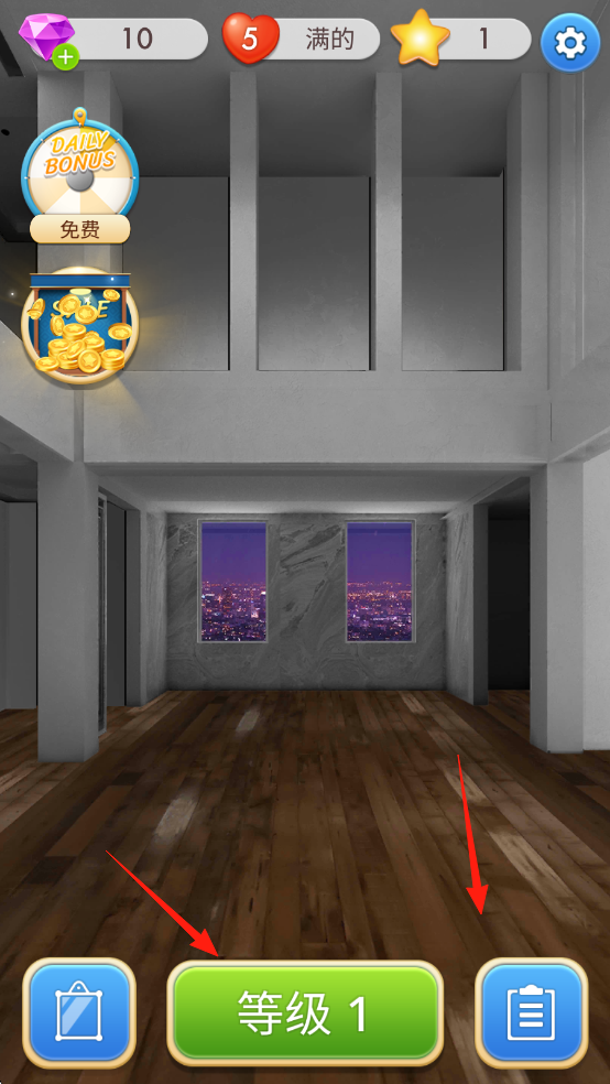 1、游戏关卡选择界面,显示等级1,有钻石(10)、爱心(5,满的)、星星(1),还有DAILYBONUS每日奖励等。