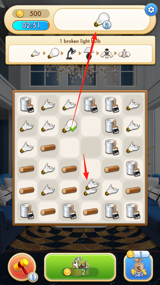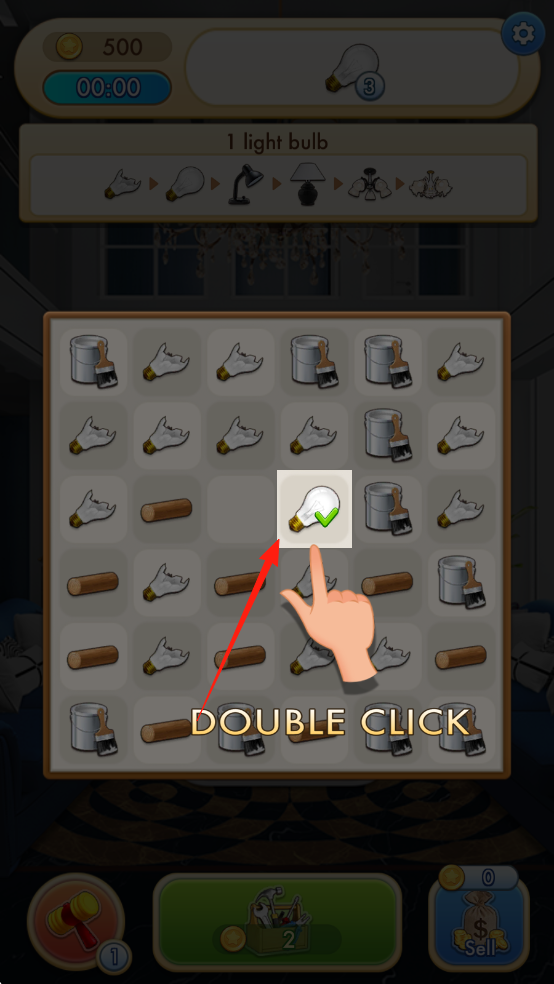2、物品合成/修复界面,需双击灯泡(lightbulb),有金币(500)、时间(00:00)等信息。