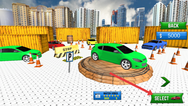 2、在时尚跑车驾驶模拟器的选车页面,点击右下角绿色【SELECT】按钮,选定绿色车辆进入关卡。