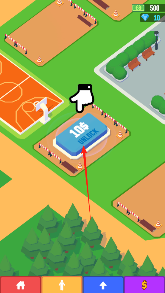 1、游戏建设界面,显示可花费10美元解锁新建筑,有金币(500)、钻石(10)资源,场景含篮球场、道路等。
