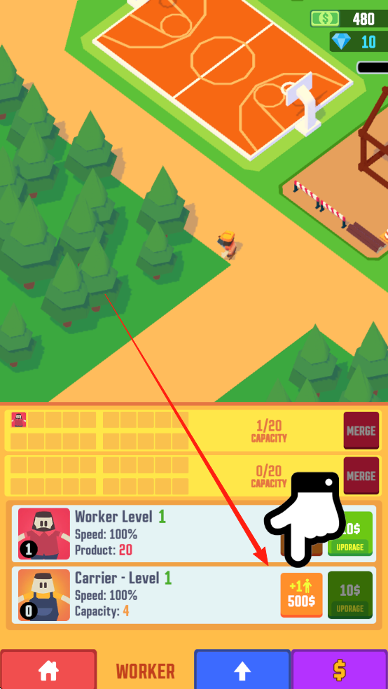 2、工人管理界面,可升级Carrier-Level1搬运工1级,有升级花费提示(500美元),显示工人属性(速度、容量等)。