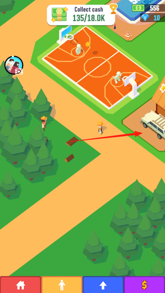 3、游戏场景界面,有篮球场、树木、工人,可收集现金135/18.0K,显示金币556、钻石10,红色箭头指向车辆。