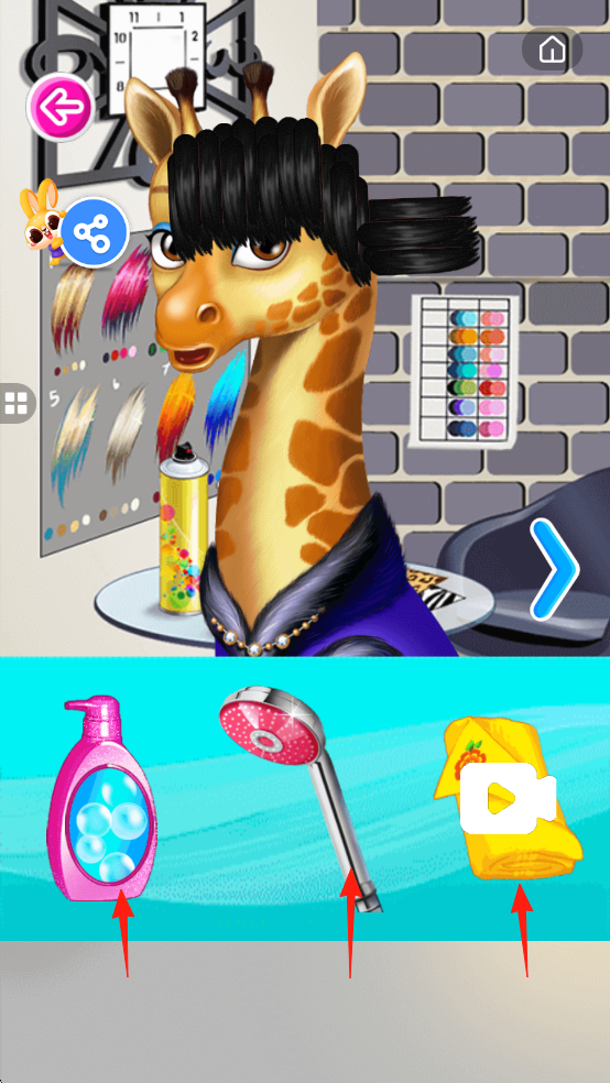 2、美发操作界面,长颈鹿角色,可使用洗发水、淋浴、毛巾等工具进行美发。