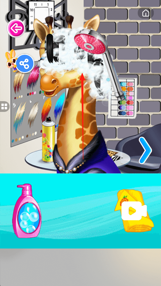 3、美发操作过程界面,可以根据红色指示箭头把淋浴对准长颈鹿的头进行洗头,有泡沫效果。