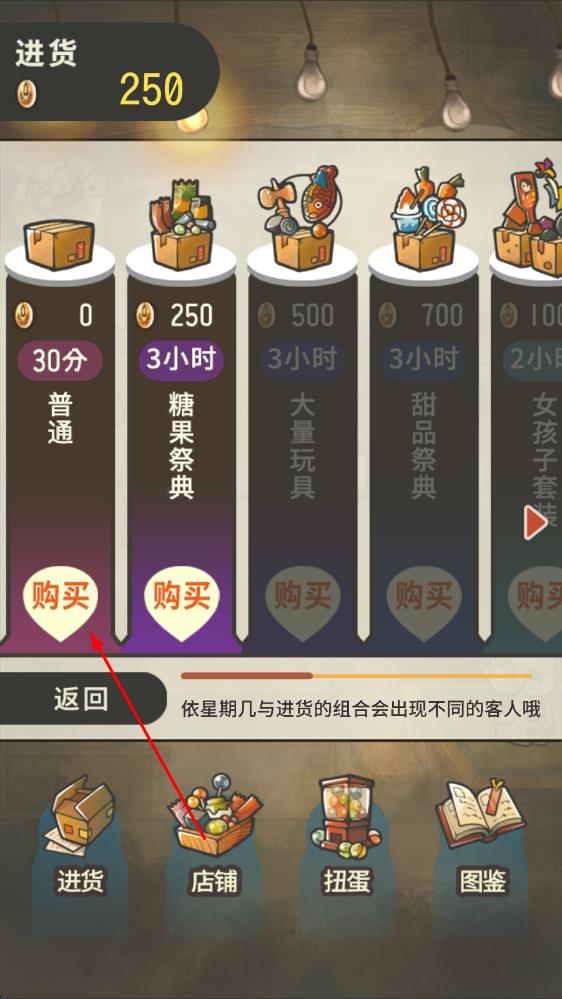 2、随着收入的增加,进入“店铺”选单,对店铺进行强化升级,店铺升级后,新的进货种类将会解锁,借此能够吸引更多不同类型的客人,让杂货店人气愈发兴旺。