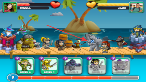 3、在对战界面,选下方英雄卡牌(如LEVEL4),拖放上场,搭配阵容,与对手(JACE)战斗。