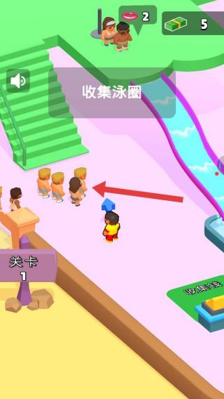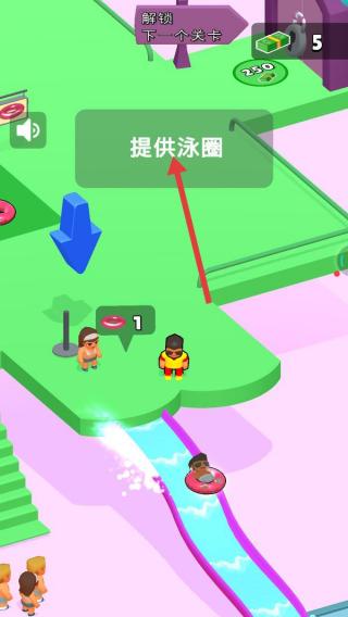 2、按【提供泳圈】提示,把泳圈拖给需求者(箭头指向处),满足游客使用滑梯需求。