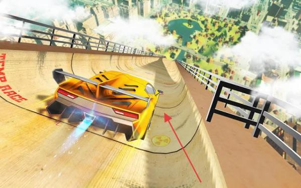3、驾驶黄色超跑,沿箭头冲下高空坡道,利用坡道落差完成飞跃特技,把控方向,着陆后继续竞速。