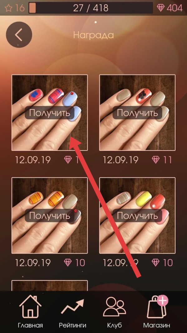 2、在奖励(Награда)界面,按箭头选美甲样式,消耗钻石(如1个),点击【Получить】领取,解锁新美甲。