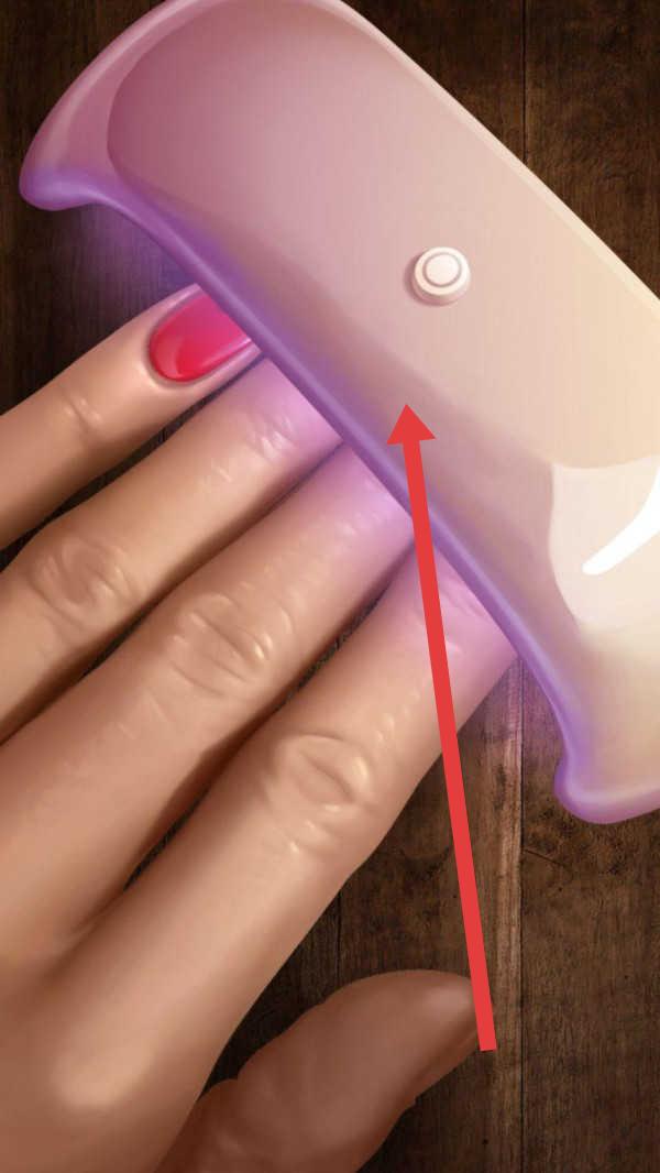 3、美甲操作时,点击箭头指向的美甲灯按钮,启动光照,完成指甲烘干步骤,推进美甲制作流程。