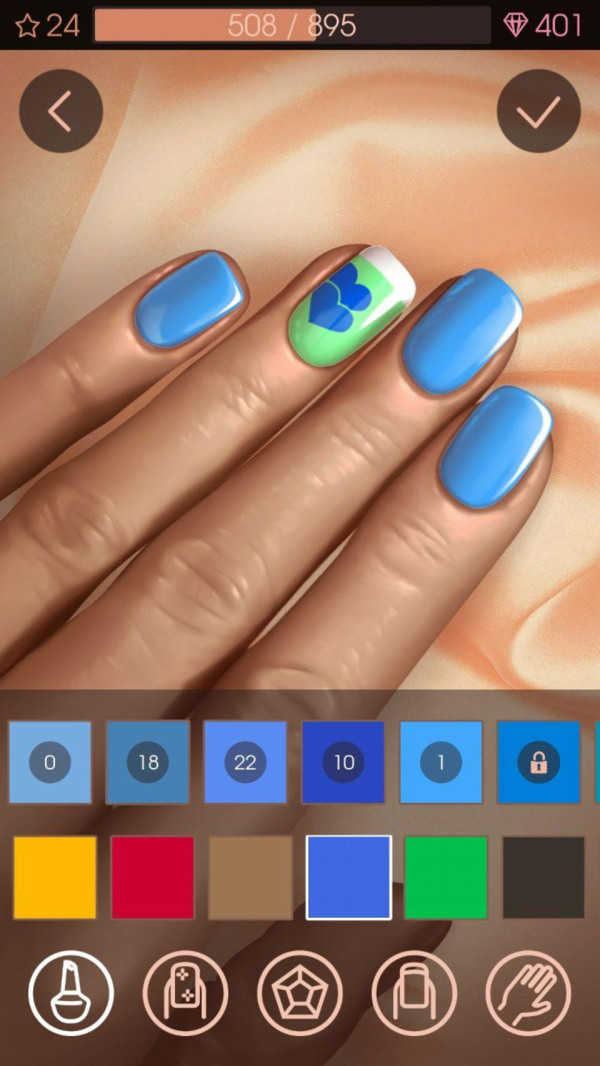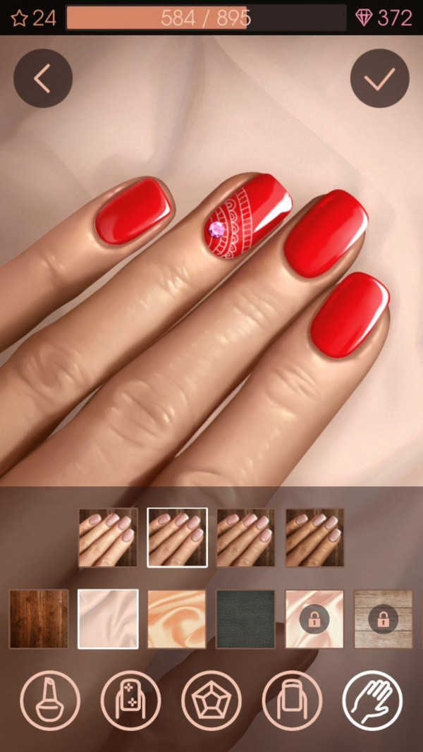2、全真流程模拟:还原真实美甲步骤,包括修剪指甲形状、打磨甲面、涂色、烤漆、贴钻等,手残玩家也能通过游玩练习精准控制技巧。