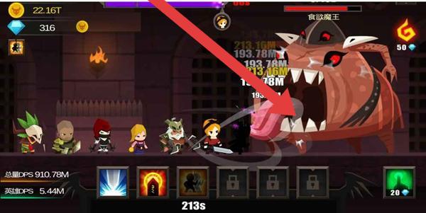 1、进入战斗,操控英雄团队对抗【贪饿魔王】,留意团队DPS数值,合理释放技能,利用英雄特性输出,快速削减Boss血量。