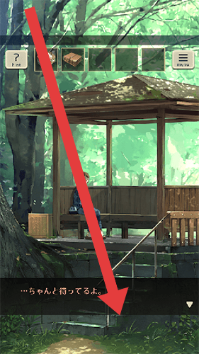 3、来到林间亭子场景,跟随红色箭头,点击亭子下方箭头指向的台阶区域,探索新场景,解锁后续游戏内容。