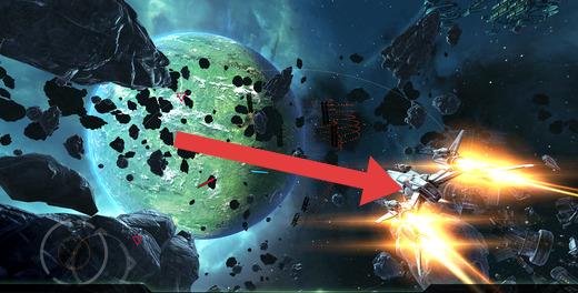 2、飞行时,操控飞船(如白色战机)在太空场景(含星球、陨石)中自由移动,无轨道限制。