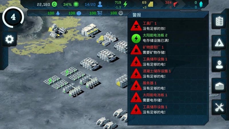 2、游戏中途,随着资源积累,不断建造工厂、运营设备,同时为工人提供生存必需品,完成各类订单任务,逐步扩大殖民地面积与规模。