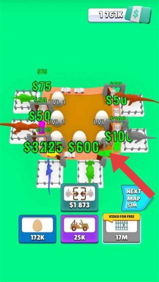3、恐龙园区场景,显示恐龙等级、收益、还有蛋、车辆等购买/升级按钮,呈现恐龙公园经营中培育、升级恐龙及设施,获取收益的玩法。