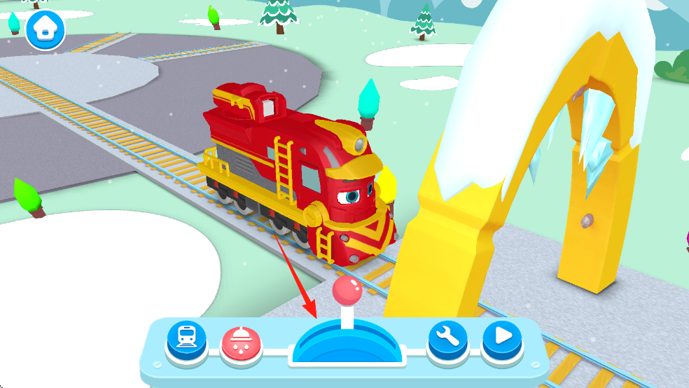 2、游戏操作界面,红色火车在轨道,有操作按钮(如方向杆等),背景是雪地场景。