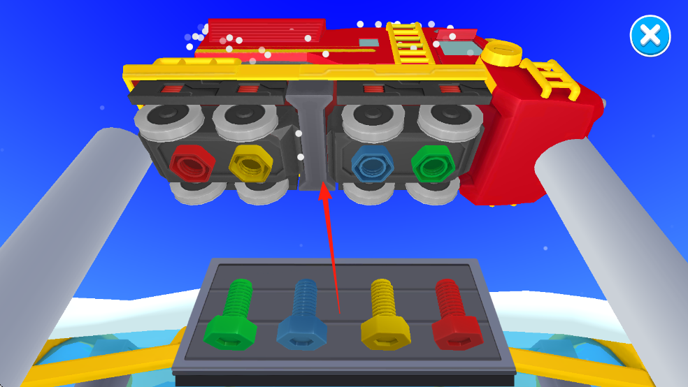 3、火车维修/组装界面,显示火车底部车轮、彩色螺丝,需匹配安装。