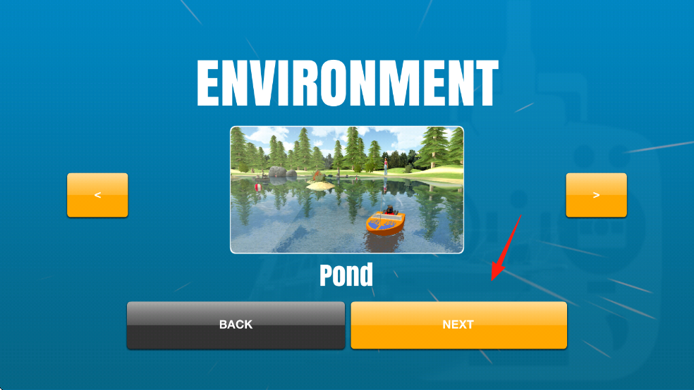 1、环境选择界面,显示“ENVIRONMENT(环境)”“Pond(池塘)”,有“BACK(返回)”“NEXT(下一步)”按钮。