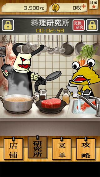 1、进入游戏后查看怪兽顾客需求,点击吧台选择已有菜品出售,积累金币后解锁“食材研究台”尝试研发新食谱。