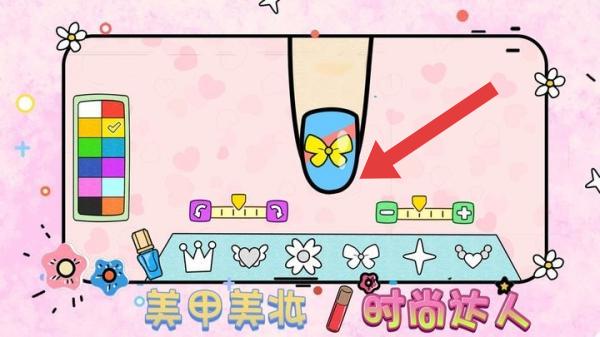 2、美甲创作界面、色彩调色板、美甲装饰元素(如蝴蝶结、皇冠等)、操作调节按钮,呈现美甲设计玩法场景。