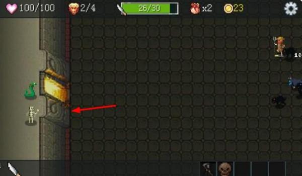 1、进入地牢后操控角色移动,探索各个房间寻找武器宝箱,点击拾取刀剑、弓箭等装备,滑动屏幕调整攻击方向,向逼近的怪物发起进攻。