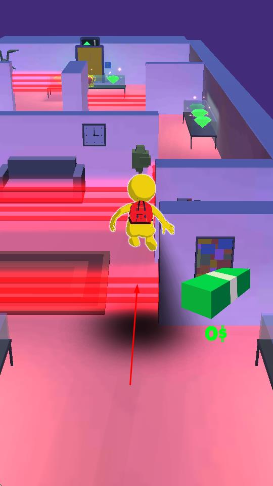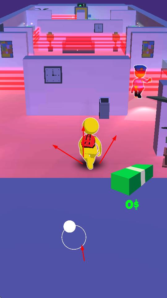1、操控黄色小人,通过虚拟摇杆在室内场景移动,避开巡逻警察,绕过红色激光区域,隐藏行踪。