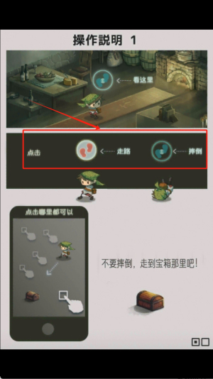 1、基础操作通过点击屏幕控制角色移动,避开障碍物收集资源。如操作说明1提示的不要摔倒,走到宝箱那里吧。
