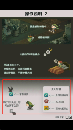 3、关卡设计创意十足,每个场景都设有独特机关和敌人配置。如操作说明2中展示的荆棘地板和ZZZ状态系统,需要谨慎应对。