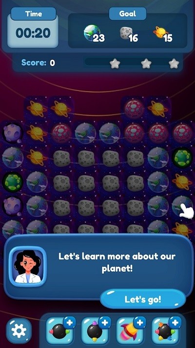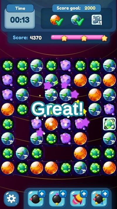 1、萌系视觉风格:采用圆润线条与明亮色彩塑造星际元素,Q版星球眨巴着大眼睛,飞船拖着彩虹尾迹,搭配消除时的软萌音效,营造治愈系游戏氛围。