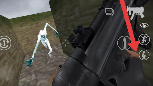 2、遇突袭,点右侧【下蹲/站立】按键,利用掩体规避SCP怪物攻击,同时保持射击,保障生存。