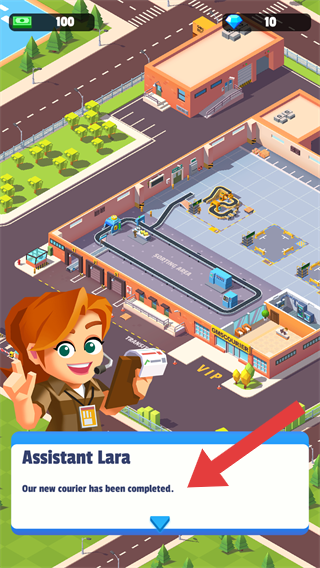 1、角色AssistantLara(劳拉助手),提示内容我们的新快递员已完成,画面呈现游戏中的快递站场景,有建筑、设施及角色互动。