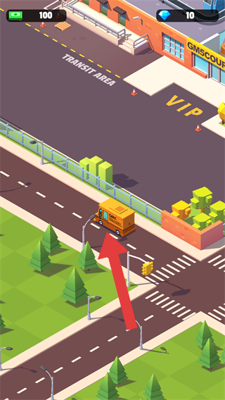 2、呈现了游戏里的运输场景,有标着TRANSITAREA(转运区)和VIP区域的场地、道路、快递车等元素,属于快递运输模拟经营类画面。