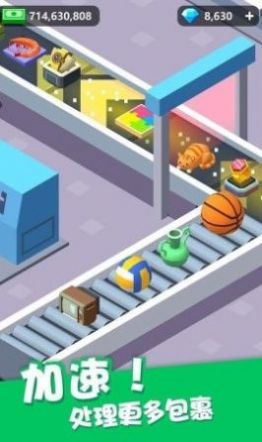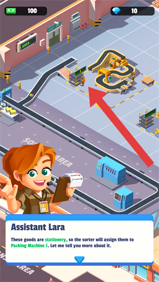 3、这些货物是文具,所以分拣机会把它们分配到1号包装机,让我来给你详细讲讲,还有游戏内的设施如分拣设备、包装机等场景元素。