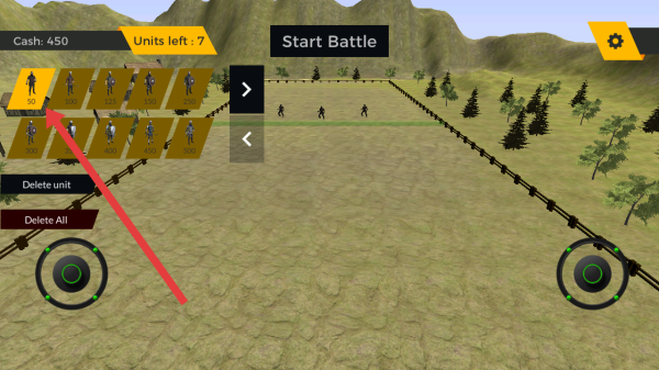 2、在部队部署的界面,操控者需要点击左侧【50】金币的基础士兵卡牌,招募该兵种加入战斗。