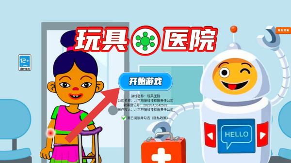 1、呈现游戏名称、开始游戏按钮,属于模拟经营类游戏,玩家可点击【开始游戏】进入经营玩具医院的玩法。
