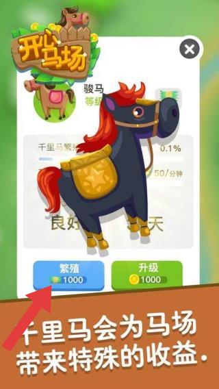 2、展示骏马信息,含等级、属性(如千里马概率0.1%)、状态(良好),有繁殖(消耗1000货币),体现通过养成千里马为马场带来特殊收益的玩法。