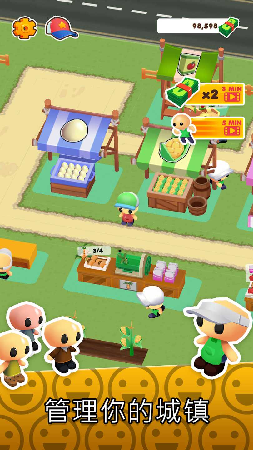 3、画面呈现农场中角色、种植区域、售卖摊位等元素,角色可进行种植、经营相关操作,属于模拟经营玩法里的农场建设与资源管理环节。