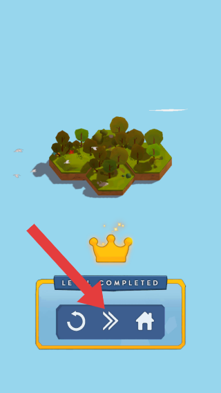 3、LEVELCOMPLETED表明关卡已完成,下方按钮从左到右分别是重新开始、进入下一关、返回主页功能,画面呈现了已建造的岛屿场景。