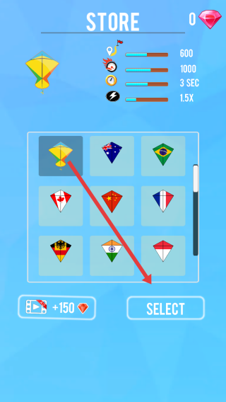 2、商店界面,选黄色风筝,点击【SELECT】,确认使用该风筝,可观看广告(+150钻石)解锁更多皮肤。