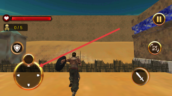 2、战斗时,用虚拟摇杆操控角色移动,靠近箭头指向区域,应对敌人,完成“0/5”杀敌目标,推进关卡。