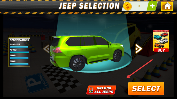 2、在吉普选择页,选绿色吉普,点击【SELECT】,确定车辆参与停车挑战。