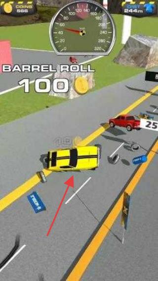 2、比赛时,驾驶黄色赛车,沿道路行驶,触发【BARREL ROLL 100】特技,躲避障碍(红色车)。