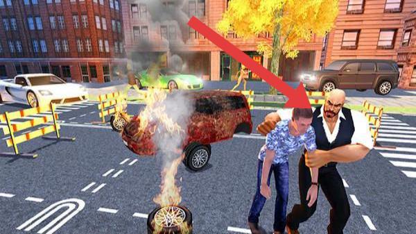 1、在城市街道场景,操控角色解救被挟持者,避开燃烧车辆等危险,完成救援任务。