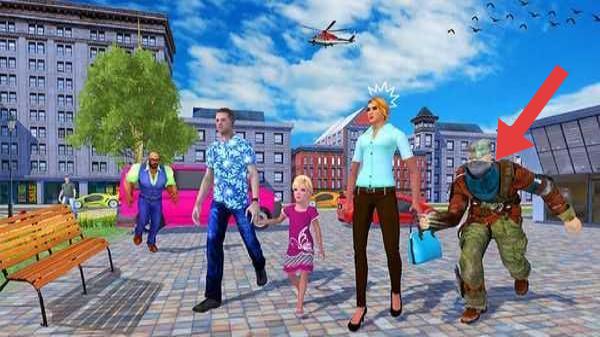 3、在广场区域,跟随人群移动,完成互动任务(如护送、收集),留意直升机等场景元素。