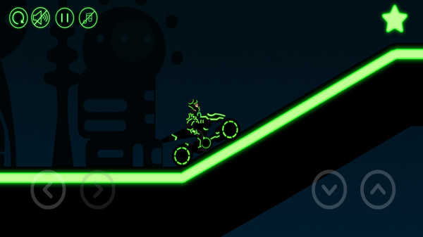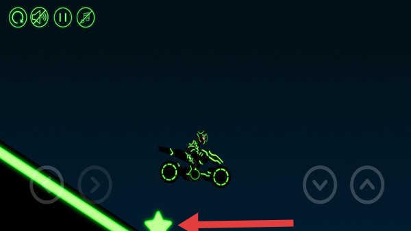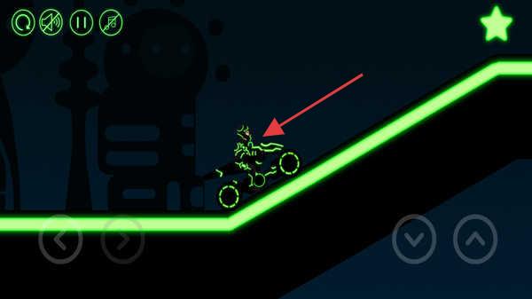 1、操控荧光摩托,沿绿色赛道爬坡,注意平衡,利用左右按键调整,收集星星。