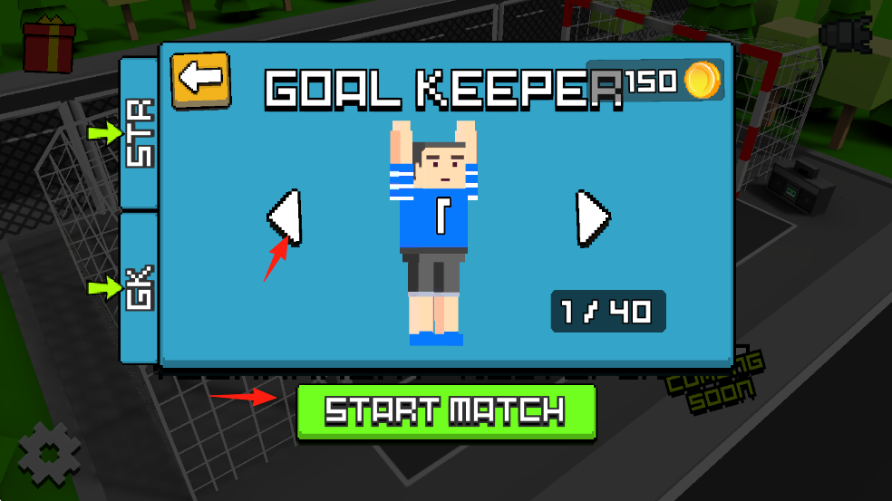 1、进入游戏,选【GOALKEEPER】角色,确认后点【STARTMATCH】开启比赛,用左右箭头操控门将移动。
