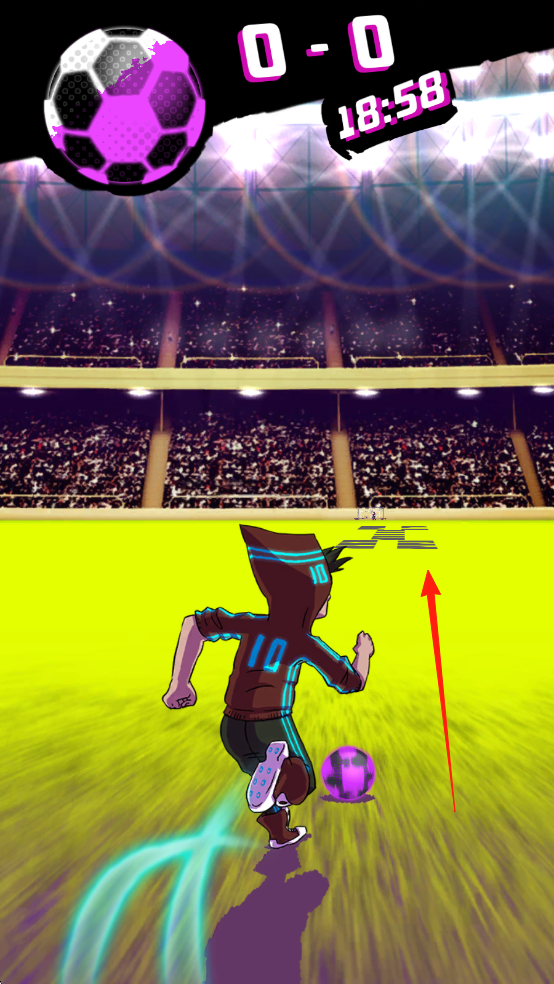 2、游戏进行界面,显示比分“0-0”、时间“18:58”,角色带球,有足球特效。