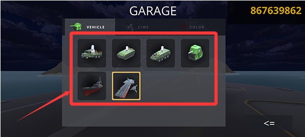 1、先在“GARAGE”里面选择合适的武器装备和你想要进行战斗的军事武器。