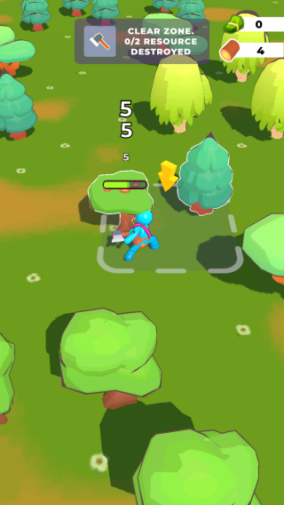 1、清理区域,需摧毁2个资源的任务提示、树木资源、显示数量4的道具,玩法为操控角色在场景完成资源摧毁等任务,推进建造进程。